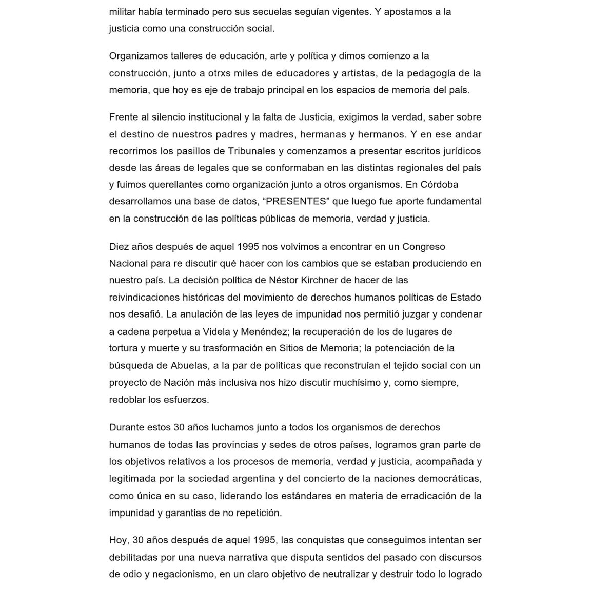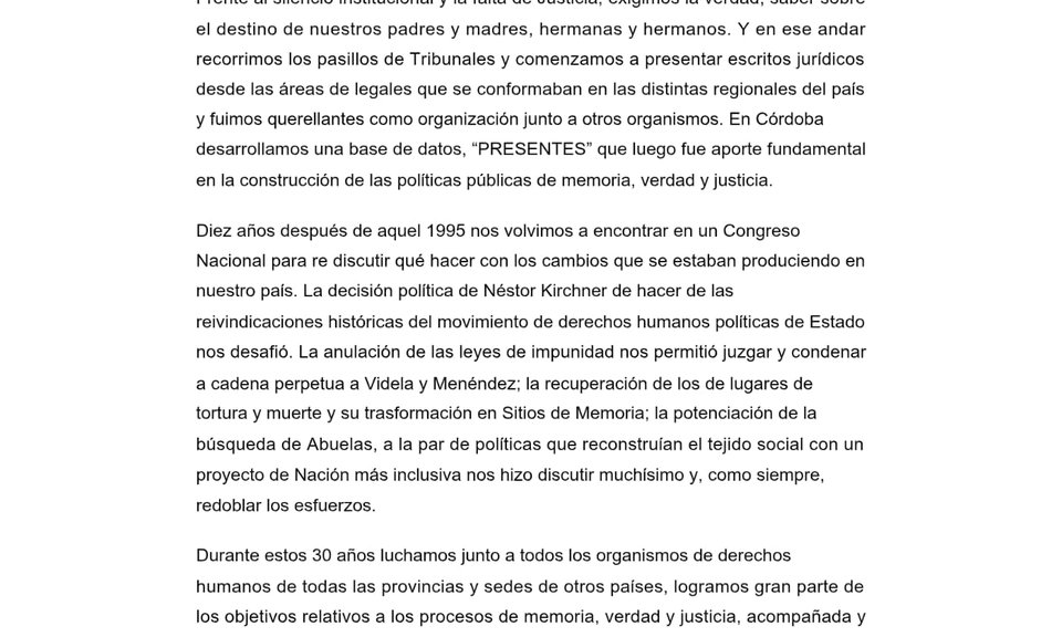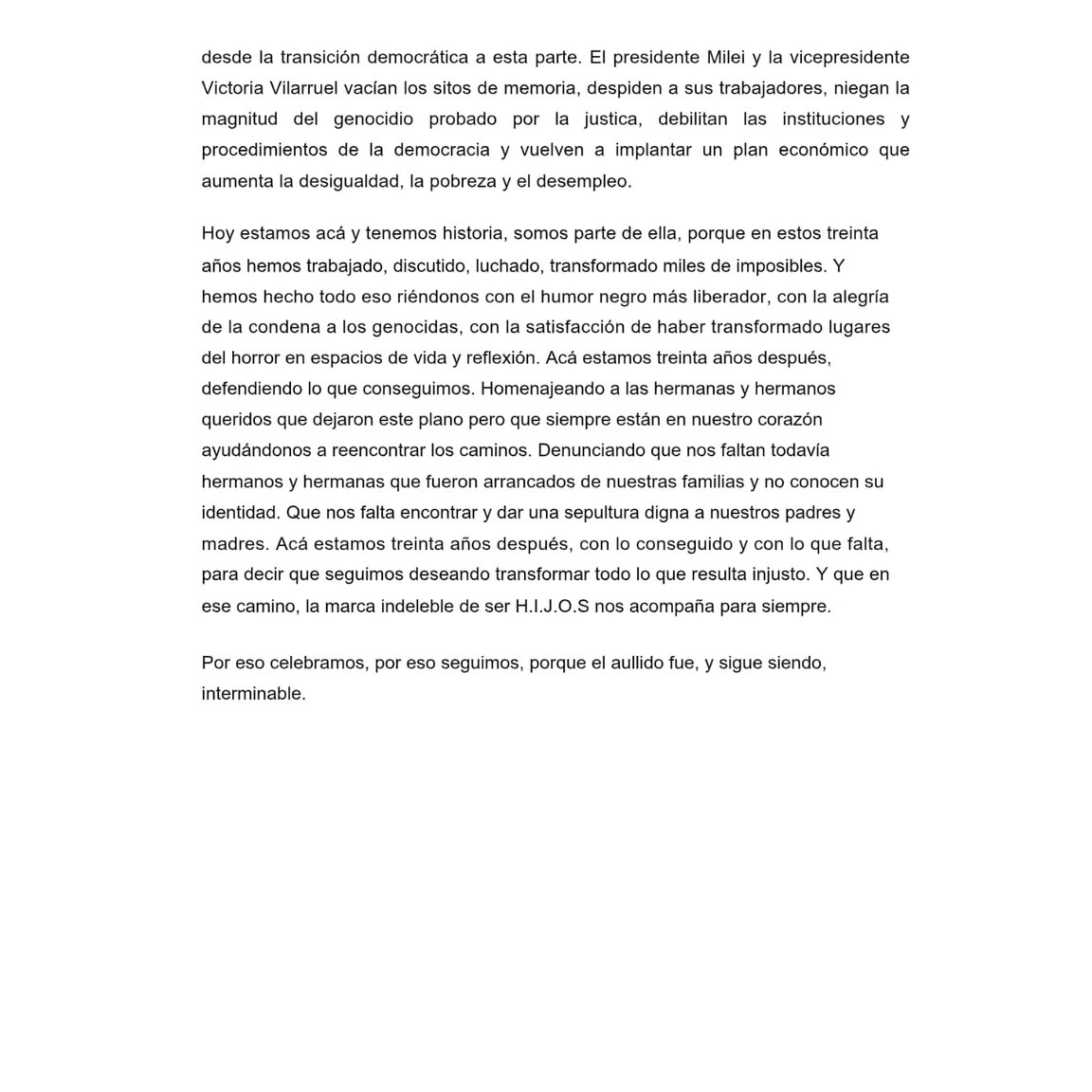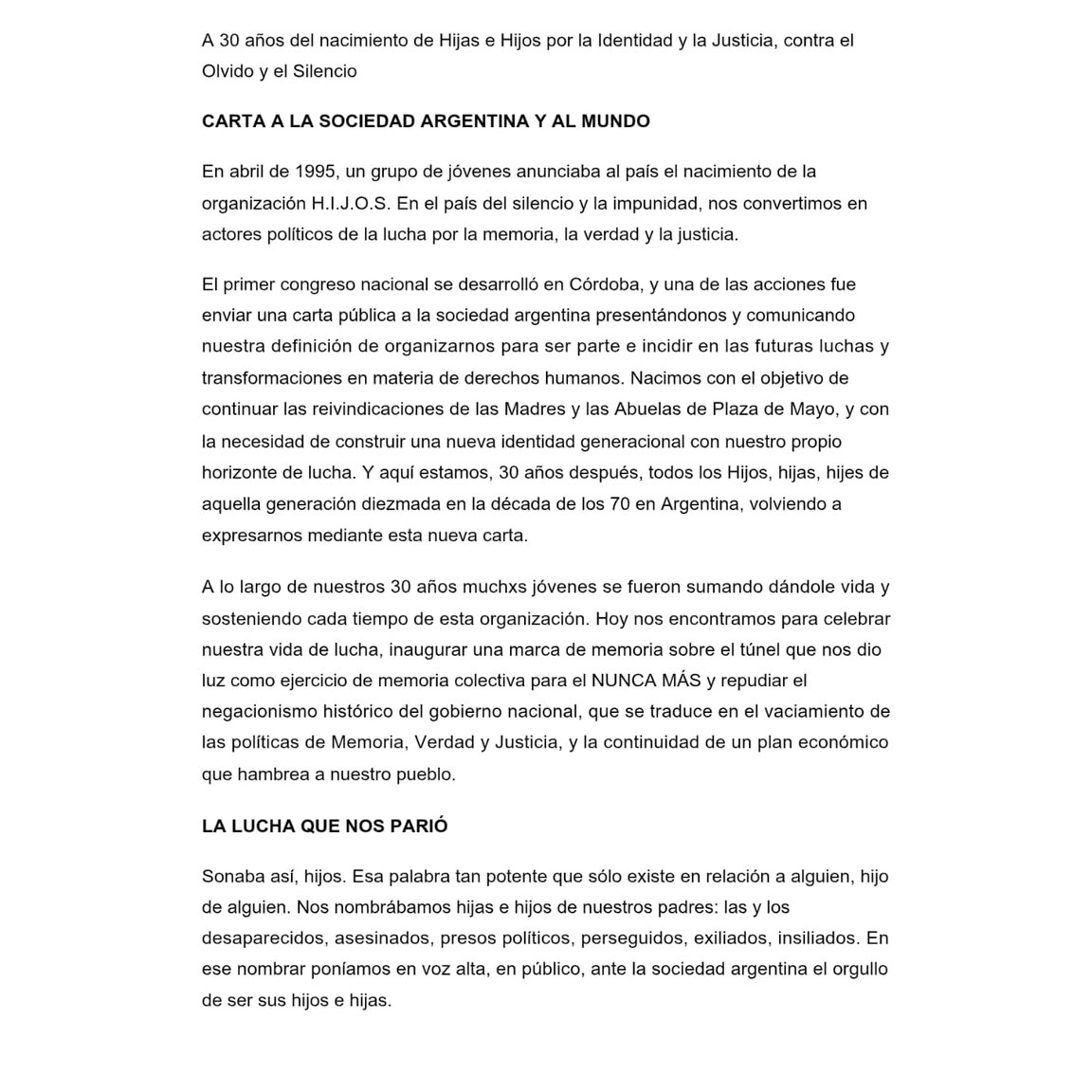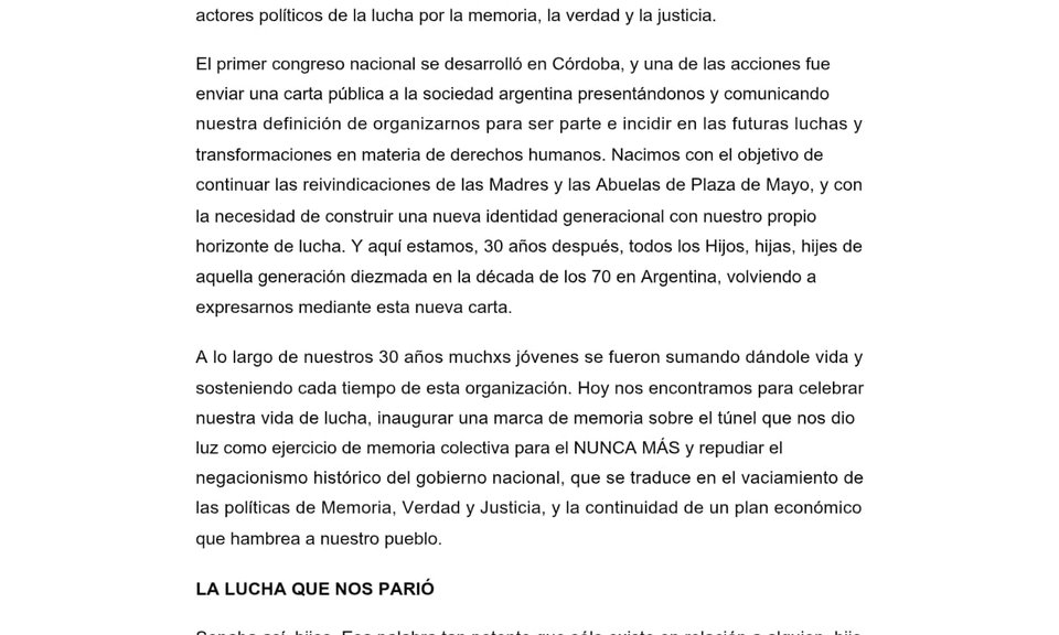 La carta leída en el acto relata que una de las primeras acciones realizadas por la agrupación en 1995 fue enviar una carta pública a la sociedad argentina presentándose y comunicando la definición de organizarse "P𝙖𝙧𝙖 𝙨𝙚𝙧 𝙥𝙖𝙧𝙩𝙚 𝙚 𝙞𝙣𝙘𝙞𝙙𝙞𝙧 𝙚𝙣 𝙡𝙖𝙨 𝙛𝙪𝙩𝙪𝙧𝙖𝙨 𝙡𝙪𝙘𝙝𝙖𝙨 𝙮 𝙩𝙧𝙖𝙣𝙨𝙛𝙤𝙧𝙢𝙖𝙘𝙞𝙤𝙣𝙚𝙨 𝙚𝙣 𝙢𝙖𝙩𝙚𝙧𝙞𝙖 𝙙𝙚 𝙙𝙚𝙧𝙚𝙘𝙝𝙤𝙨 𝙝𝙪𝙢𝙖𝙣𝙤𝙨. 𝙉𝙖𝙘𝙞𝙢𝙤𝙨 𝙘𝙤𝙣 𝙚𝙡 𝙤𝙗𝙟𝙚𝙩𝙞𝙫𝙤 𝙙𝙚 𝙘𝙤𝙣𝙩𝙞𝙣𝙪𝙖𝙧 𝙡𝙖𝙨 𝙧𝙚𝙞𝙫𝙞𝙣𝙙𝙞𝙘𝙖𝙘𝙞𝙤𝙣𝙚𝙨 𝙙𝙚 𝙡𝙖𝙨 𝙈𝙖𝙙𝙧𝙚𝙨 𝙮 𝙡𝙖𝙨 𝘼𝙗𝙪𝙚𝙡𝙖𝙨 𝙙𝙚 𝙋𝙡𝙖𝙯𝙖 𝙙𝙚 𝙈𝙖𝙮𝙤, 𝙮 𝙘𝙤𝙣 𝙡𝙖 𝙣𝙚𝙘𝙚𝙨𝙞𝙙𝙖𝙙 𝙙𝙚 𝙘𝙤𝙣𝙨𝙩𝙧𝙪𝙞𝙧 𝙪𝙣𝙖 𝙣𝙪𝙚𝙫𝙖 𝙞𝙙𝙚𝙣𝙩𝙞𝙙𝙖𝙙 𝙜𝙚𝙣𝙚𝙧𝙖𝙘𝙞𝙤𝙣𝙖𝙡 𝙘𝙤𝙣 𝙣𝙪𝙚𝙨𝙩𝙧𝙤 𝙥𝙧𝙤𝙥𝙞𝙤 𝙝𝙤𝙧𝙞𝙯𝙤𝙣𝙩𝙚 𝙙𝙚 𝙡𝙪𝙘𝙝𝙖. 𝙔 𝙖𝙦𝙪í 𝙚𝙨𝙩𝙖𝙢𝙤𝙨, 30 𝙖ñ𝙤𝙨 𝙙𝙚𝙨𝙥𝙪é𝙨, 𝙩𝙤𝙙𝙤𝙨 𝙡𝙤𝙨 𝙃𝙞𝙟𝙤𝙨, 𝙝𝙞𝙟𝙖𝙨, 𝙝𝙞𝙟𝙚𝙨 𝙙𝙚 𝙖𝙦𝙪𝙚𝙡𝙡𝙖 𝙜𝙚𝙣𝙚𝙧𝙖𝙘𝙞ó𝙣 𝙙𝙞𝙚𝙯𝙢𝙖𝙙𝙖 𝙚𝙣 𝙡𝙖 𝙙é𝙘𝙖𝙙𝙖 𝙙𝙚 𝙡𝙤𝙨 70 𝙚𝙣 𝘼𝙧𝙜𝙚𝙣𝙩𝙞𝙣𝙖, 𝙫𝙤𝙡𝙫𝙞𝙚𝙣𝙙𝙤 𝙖 𝙚𝙭𝙥𝙧𝙚𝙨𝙖𝙧𝙣𝙤𝙨 𝙢𝙚𝙙𝙞𝙖𝙣𝙩𝙚 𝙚𝙨𝙩𝙖 𝙣𝙪𝙚𝙫𝙖 𝙘𝙖𝙧𝙩𝙖"