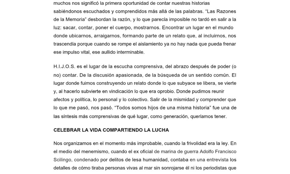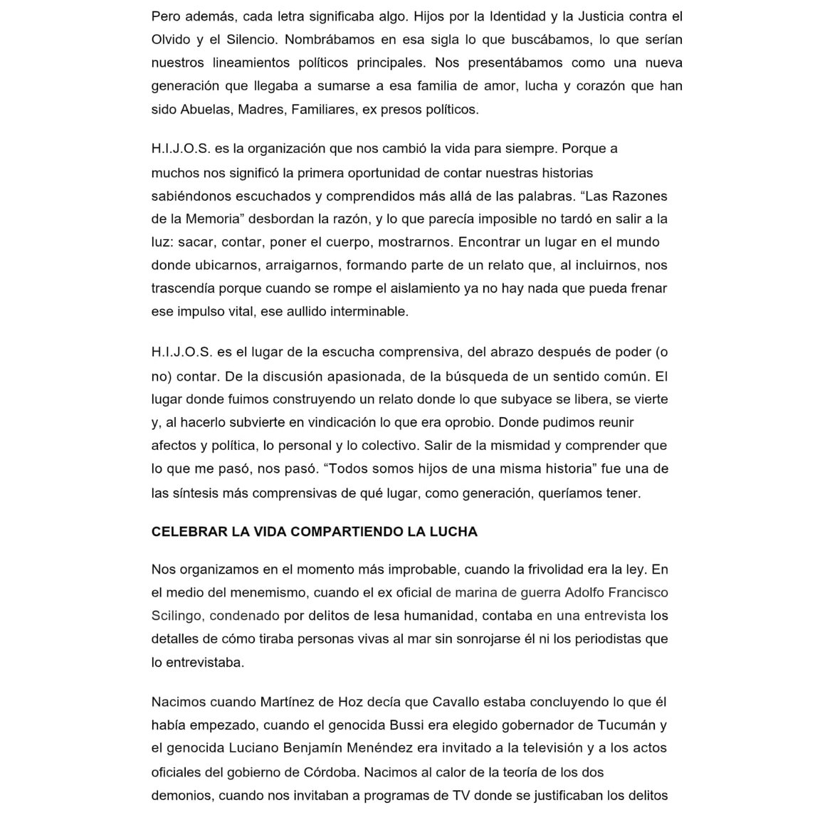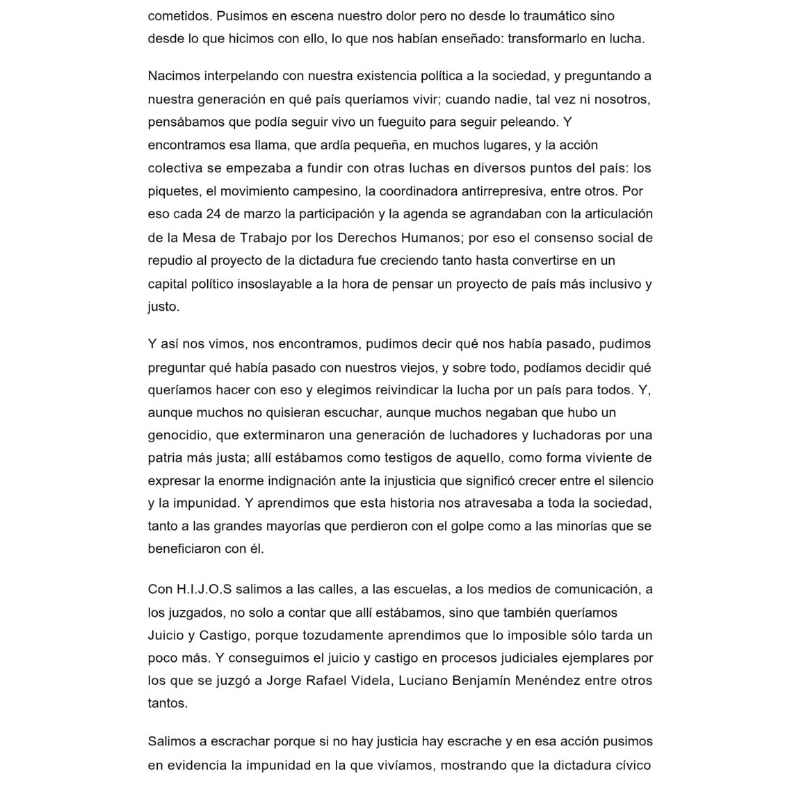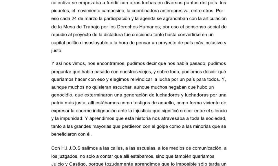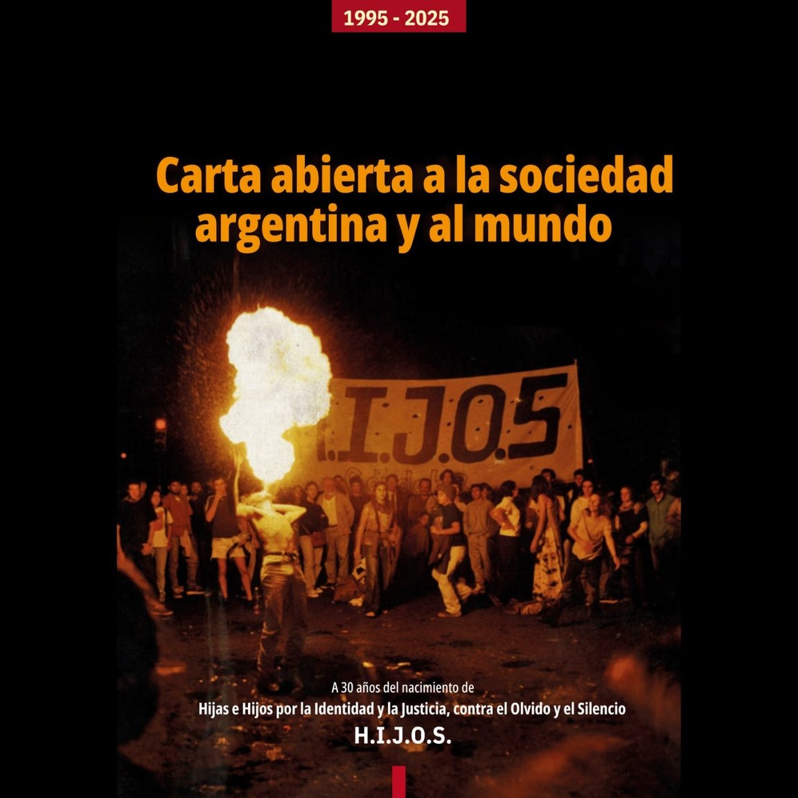 La carta leída en el acto relata que una de las primeras acciones realizadas por la agrupación en 1995 fue enviar una carta pública a la sociedad argentina presentándose y comunicando la definición de organizarse "P𝙖𝙧𝙖 𝙨𝙚𝙧 𝙥𝙖𝙧𝙩𝙚 𝙚 𝙞𝙣𝙘𝙞𝙙𝙞𝙧 𝙚𝙣 𝙡𝙖𝙨 𝙛𝙪𝙩𝙪𝙧𝙖𝙨 𝙡𝙪𝙘𝙝𝙖𝙨 𝙮 𝙩𝙧𝙖𝙣𝙨𝙛𝙤𝙧𝙢𝙖𝙘𝙞𝙤𝙣𝙚𝙨 𝙚𝙣 𝙢𝙖𝙩𝙚𝙧𝙞𝙖 𝙙𝙚 𝙙𝙚𝙧𝙚𝙘𝙝𝙤𝙨 𝙝𝙪𝙢𝙖𝙣𝙤𝙨. 𝙉𝙖𝙘𝙞𝙢𝙤𝙨 𝙘𝙤𝙣 𝙚𝙡 𝙤𝙗𝙟𝙚𝙩𝙞𝙫𝙤 𝙙𝙚 𝙘𝙤𝙣𝙩𝙞𝙣𝙪𝙖𝙧 𝙡𝙖𝙨 𝙧𝙚𝙞𝙫𝙞𝙣𝙙𝙞𝙘𝙖𝙘𝙞𝙤𝙣𝙚𝙨 𝙙𝙚 𝙡𝙖𝙨 𝙈𝙖𝙙𝙧𝙚𝙨 𝙮 𝙡𝙖𝙨 𝘼𝙗𝙪𝙚𝙡𝙖𝙨 𝙙𝙚 𝙋𝙡𝙖𝙯𝙖 𝙙𝙚 𝙈𝙖𝙮𝙤, 𝙮 𝙘𝙤𝙣 𝙡𝙖 𝙣𝙚𝙘𝙚𝙨𝙞𝙙𝙖𝙙 𝙙𝙚 𝙘𝙤𝙣𝙨𝙩𝙧𝙪𝙞𝙧 𝙪𝙣𝙖 𝙣𝙪𝙚𝙫𝙖 𝙞𝙙𝙚𝙣𝙩𝙞𝙙𝙖𝙙 𝙜𝙚𝙣𝙚𝙧𝙖𝙘𝙞𝙤𝙣𝙖𝙡 𝙘𝙤𝙣 𝙣𝙪𝙚𝙨𝙩𝙧𝙤 𝙥𝙧𝙤𝙥𝙞𝙤 𝙝𝙤𝙧𝙞𝙯𝙤𝙣𝙩𝙚 𝙙𝙚 𝙡𝙪𝙘𝙝𝙖. 𝙔 𝙖𝙦𝙪í 𝙚𝙨𝙩𝙖𝙢𝙤𝙨, 30 𝙖ñ𝙤𝙨 𝙙𝙚𝙨𝙥𝙪é𝙨, 𝙩𝙤𝙙𝙤𝙨 𝙡𝙤𝙨 𝙃𝙞𝙟𝙤𝙨, 𝙝𝙞𝙟𝙖𝙨, 𝙝𝙞𝙟𝙚𝙨 𝙙𝙚 𝙖𝙦𝙪𝙚𝙡𝙡𝙖 𝙜𝙚𝙣𝙚𝙧𝙖𝙘𝙞ó𝙣 𝙙𝙞𝙚𝙯𝙢𝙖𝙙𝙖 𝙚𝙣 𝙡𝙖 𝙙é𝙘𝙖𝙙𝙖 𝙙𝙚 𝙡𝙤𝙨 70 𝙚𝙣 𝘼𝙧𝙜𝙚𝙣𝙩𝙞𝙣𝙖, 𝙫𝙤𝙡𝙫𝙞𝙚𝙣𝙙𝙤 𝙖 𝙚𝙭𝙥𝙧𝙚𝙨𝙖𝙧𝙣𝙤𝙨 𝙢𝙚𝙙𝙞𝙖𝙣𝙩𝙚 𝙚𝙨𝙩𝙖 𝙣𝙪𝙚𝙫𝙖 𝙘𝙖𝙧𝙩𝙖"