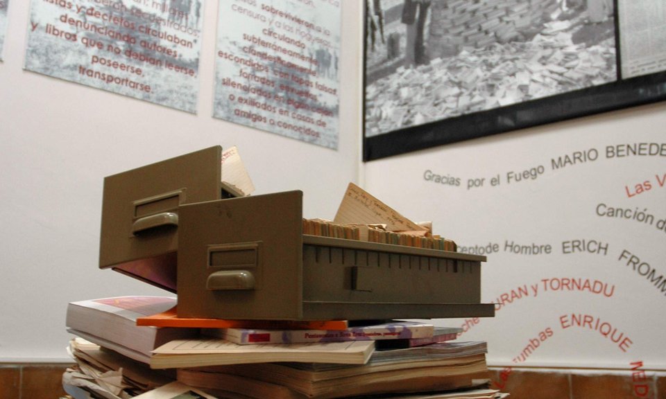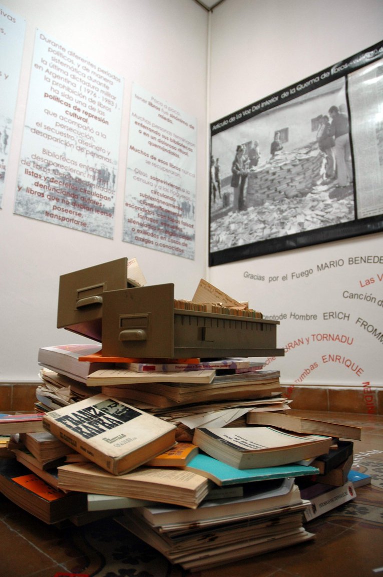 Esta muestra que itinera de rincón en rincón es parte de la sala permanente de Libros Prohibidos que se encuentra en el Archivo Provincial de la Memoria de Córdoba ( ex CCDYT D2). Poner QR al catalogo