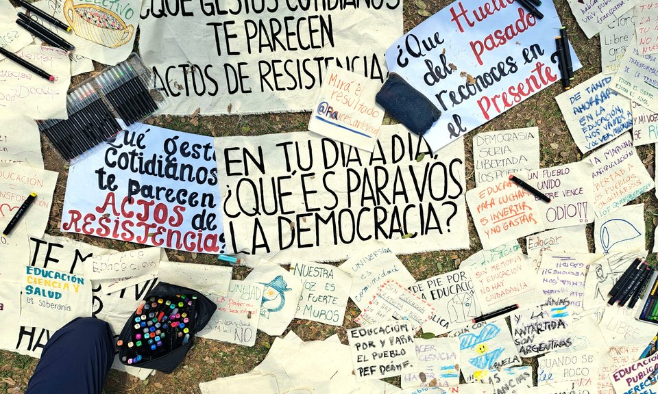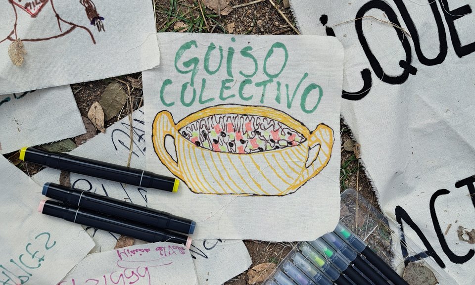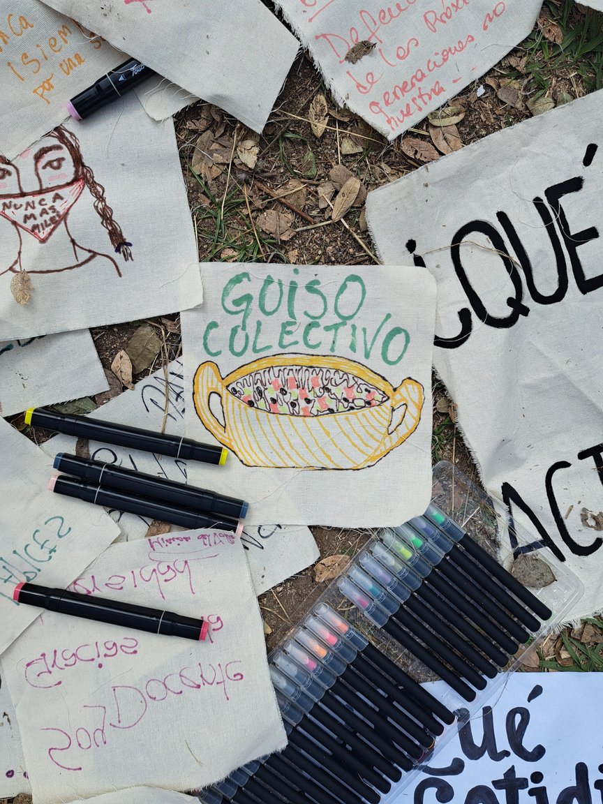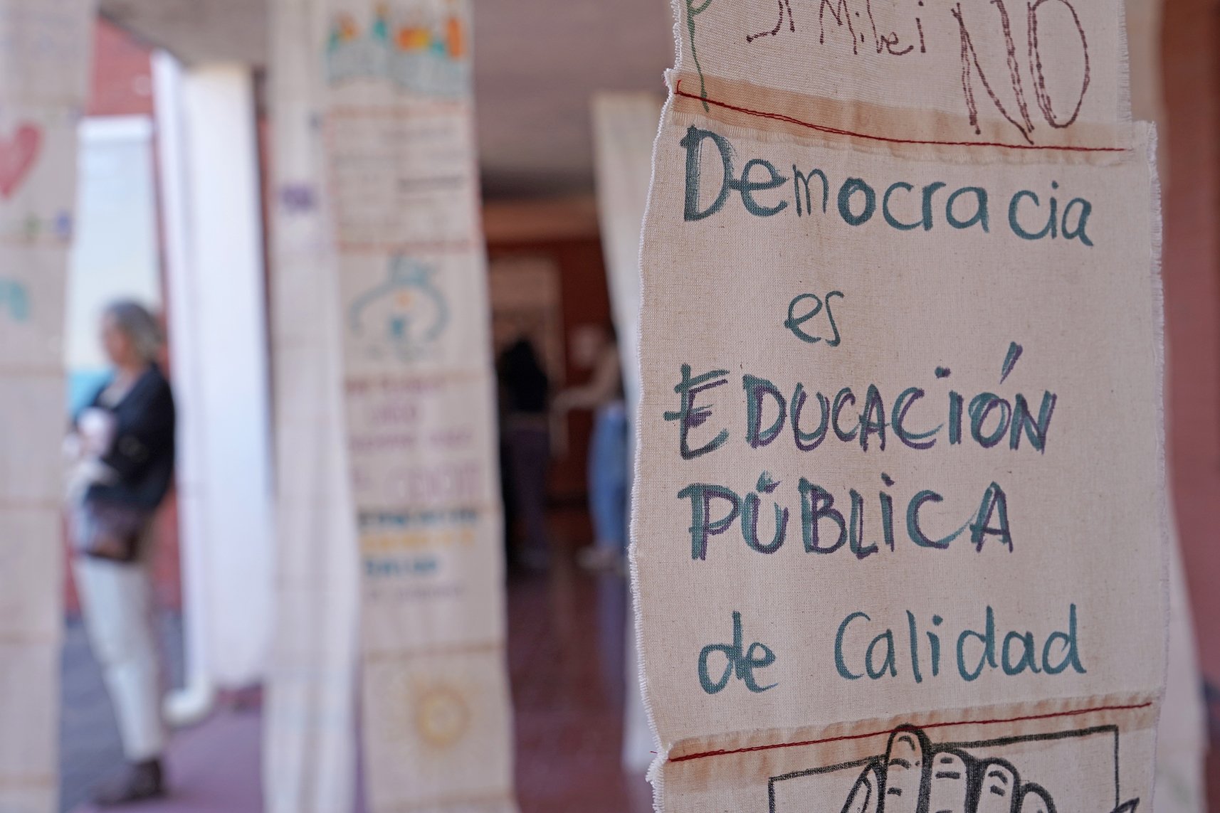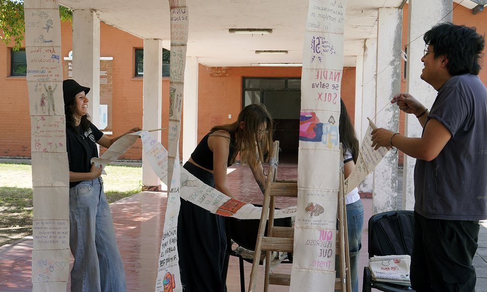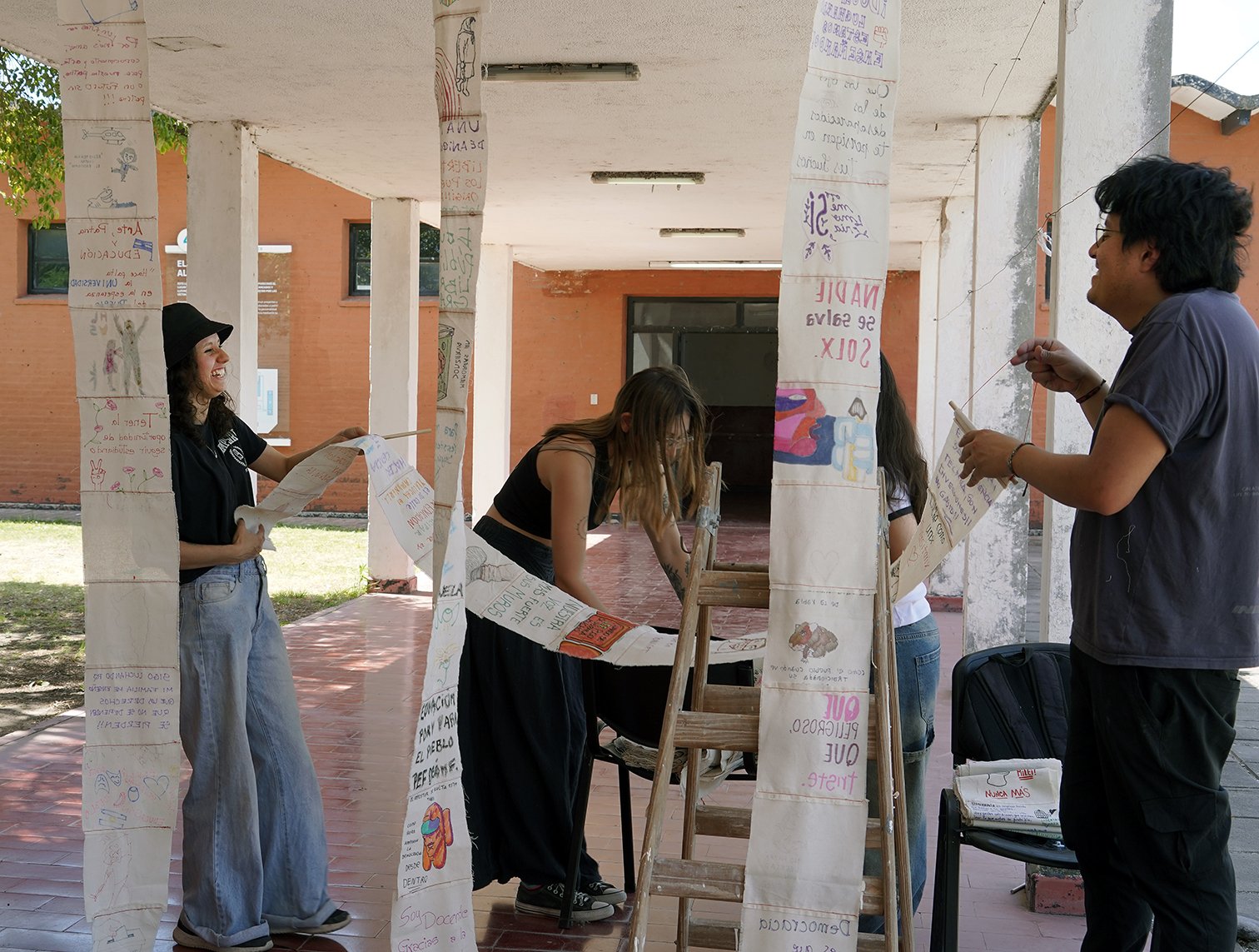 Instalación textil colaborativa que entreteje intervenciones individuales dentro de gestos colectivos de resistencia y esperanza.