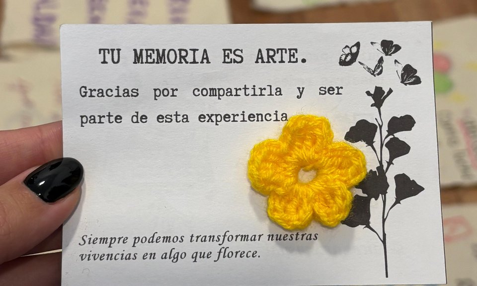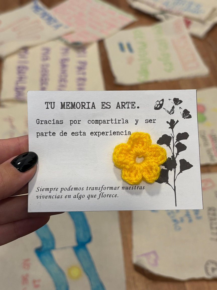 Recolectores de Memorias funciona como un dispositivo que expresa la acción de entretejer y conectar las historias que han sido silenciadas, con nuestras voces en el presente. La instalación se organiza en dos dimensiones entre el espacio y la obra textil colectiva. El lugar elegido fue el pasillo que va hacia la Cuadra, interactuando así de manera necesaria para que los espectadores lo recorran y atraviesen de una manera lenta y reflexiva. Antes de ingresar al espacio central de reclusión, los invitados transitan las historias, pensamientos y memorias compartidas de cada persona que participó, resignificando el camino de dolor hacia la esperanza que se construye colectivamente, como una luz que atraviesa la oscuridad. La obra está conformada por tiras de 2.6 metros x 20 cm, que a su vez se forma de cuadrados de 20 x 20 cm, unidos entre sí, con cada uno de los testimonios hechos con palabras, dibujos y experiencias que recolectamos. El objetivo de este proyecto es que cada fragmento de dolor y olvido se conviertan en arte, hogar, amor y esperanza, buscando llevar un destello simbólico de resistencia comunitaria hacia uno de los lugares más oscuros de nuestra historia como país.